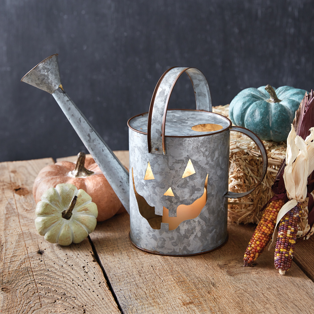 Portraying a ghastly smile carved into a watering can, our jack-o-lantern luminary will complete your outdoor Halloween decor. Illuminate the steps of a porch or set him on your tabletops for a unique look. Simply place a candle inside its hinged door to bring it to life. Item is made of galvanized metal.