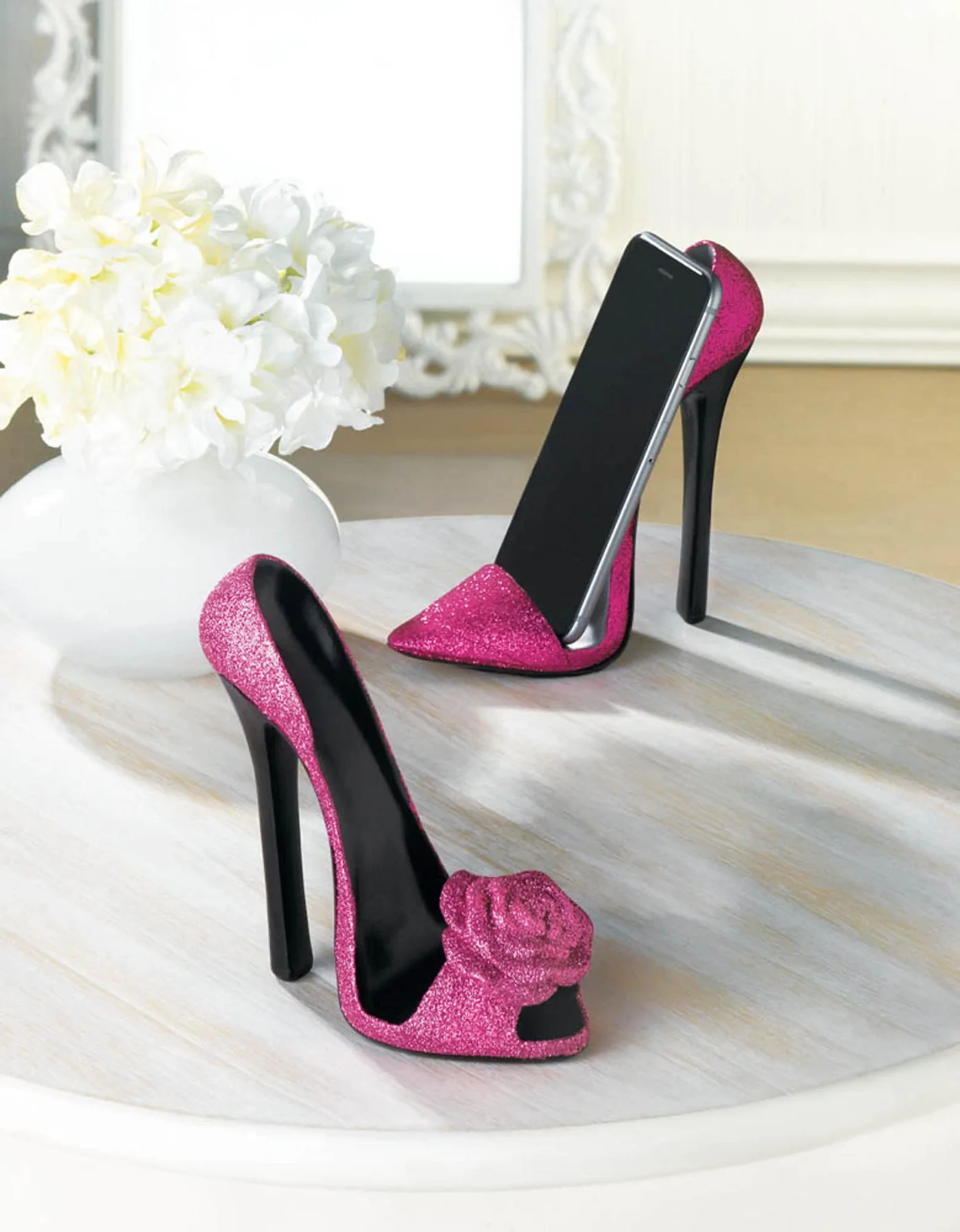 • Keep an eye on your phone and your style with an absolutely charming phone holder. This pink sparkly shoe features a high-fashion pointed toe and sky-high heel that keeps your phone upright and easy to see.