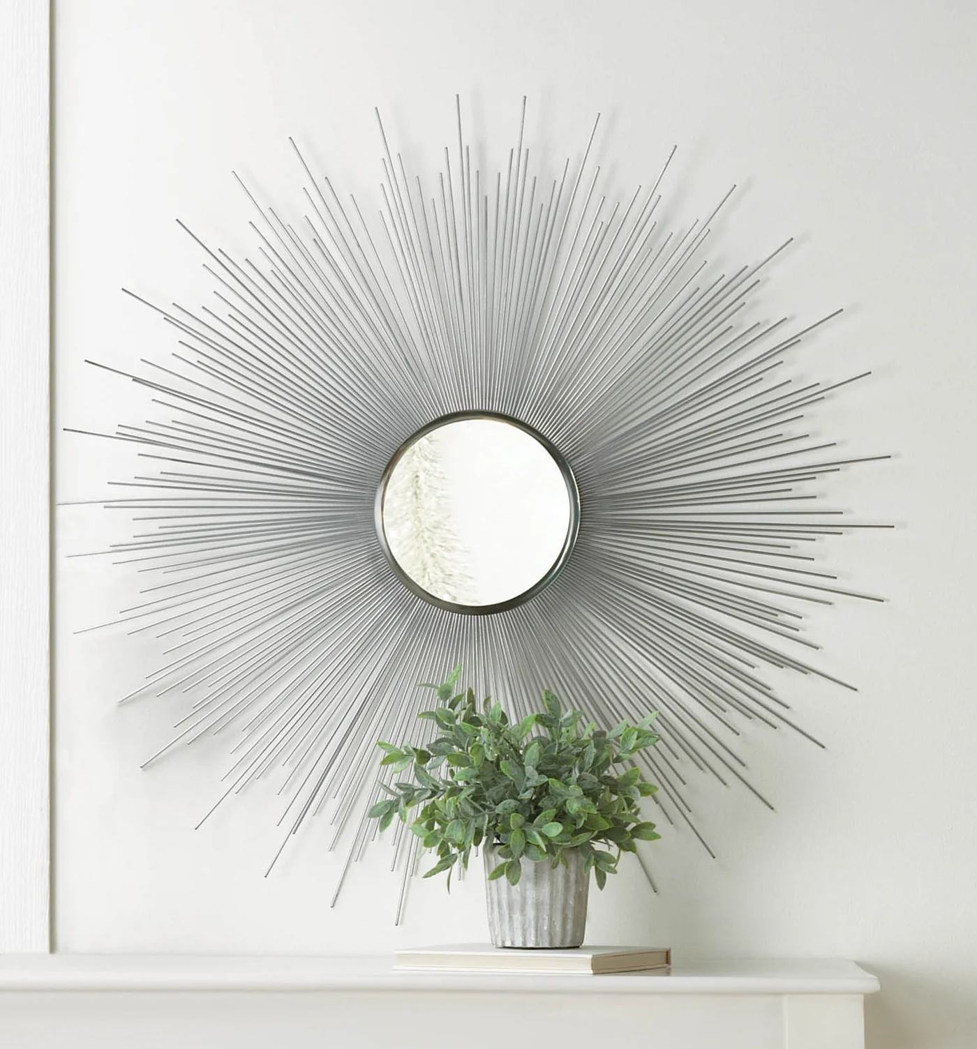 Liven up your wall with this gorgeous silver mirror. It features beautiful silver rays emanating from a small beveled round mirror set in the center. This will look great above your fireplace, in your entry, or in your living room. Mirror dimensions: 8" x 8" Weight 7.5 pounds. 33" x 33" x 0". Iron, Glass. UPC Number: 849179034252.